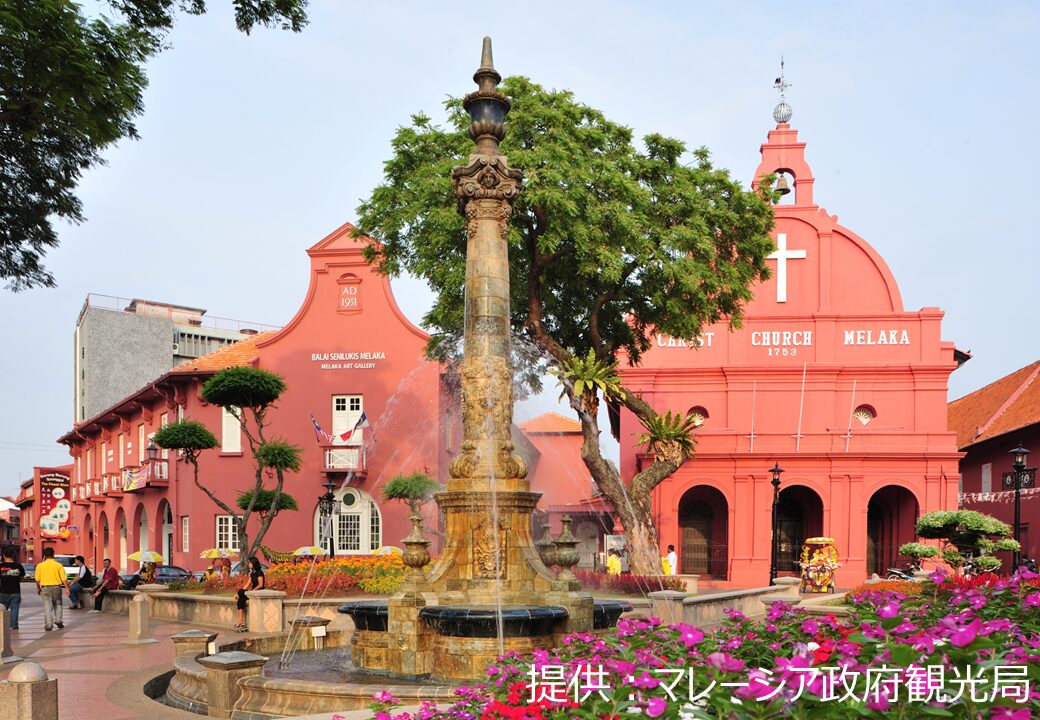 マラッカを象徴する場所、オランダ広場。17~18世紀にかけての歴史的建物が美しく保存されている観光の中心地です。広場にある「I love Melaka」の像は人気の記念撮影スポット、トライショー乗り場でもあります