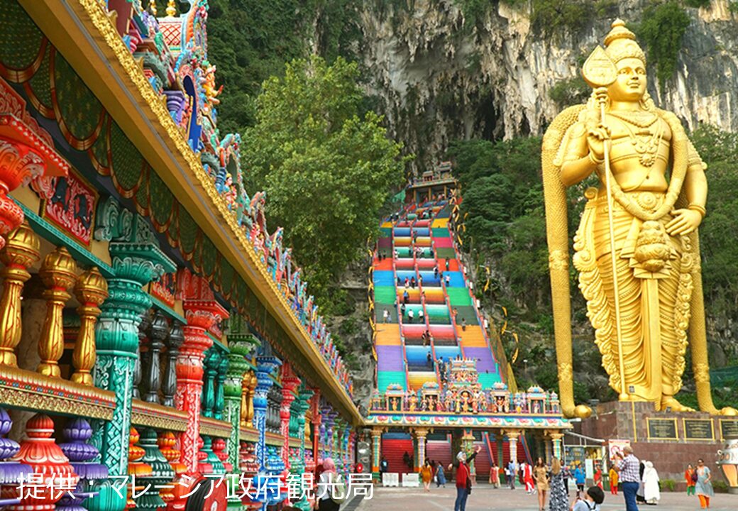 マレーシア最大規模のヒンドゥー寺院。石灰岩からなる山塊の内部に寺院があり、神々が祀られた洞窟の入り口まで、272段もの階段が続いています。2018年、この階段がカラフルに塗り替えられ、写真映えスポットとしても注目を集めるようになりました。奇祭ともいわれる年に1度のタイプーサムの日には、10万人もの巡礼者がつめかけます。