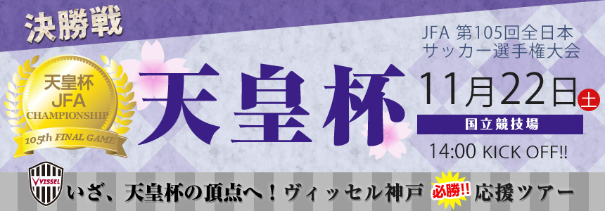 11月22日(土)開催の、天皇杯 JFA 第105回全日本サッカー選手権大会決勝(14:00キックオフ/国立競技場)の応援ツアー参加者を募集いたします。今回は貸切バスのみと貸切バス観戦チケット付き(ゴール裏自由席1層確約)の2プランをご案内させていただきます。