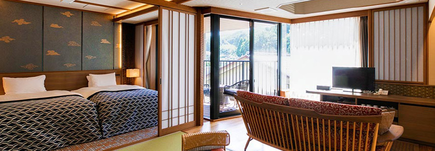 100室以上あるお部屋は、それぞれに趣が異なり、和室をはじめ、和モダンなベッドタイプの和洋室、源泉掛け流し風呂がついた客室、贅沢な特別室など、宿泊スタイルに合わせたお部屋をお選びいただけます。